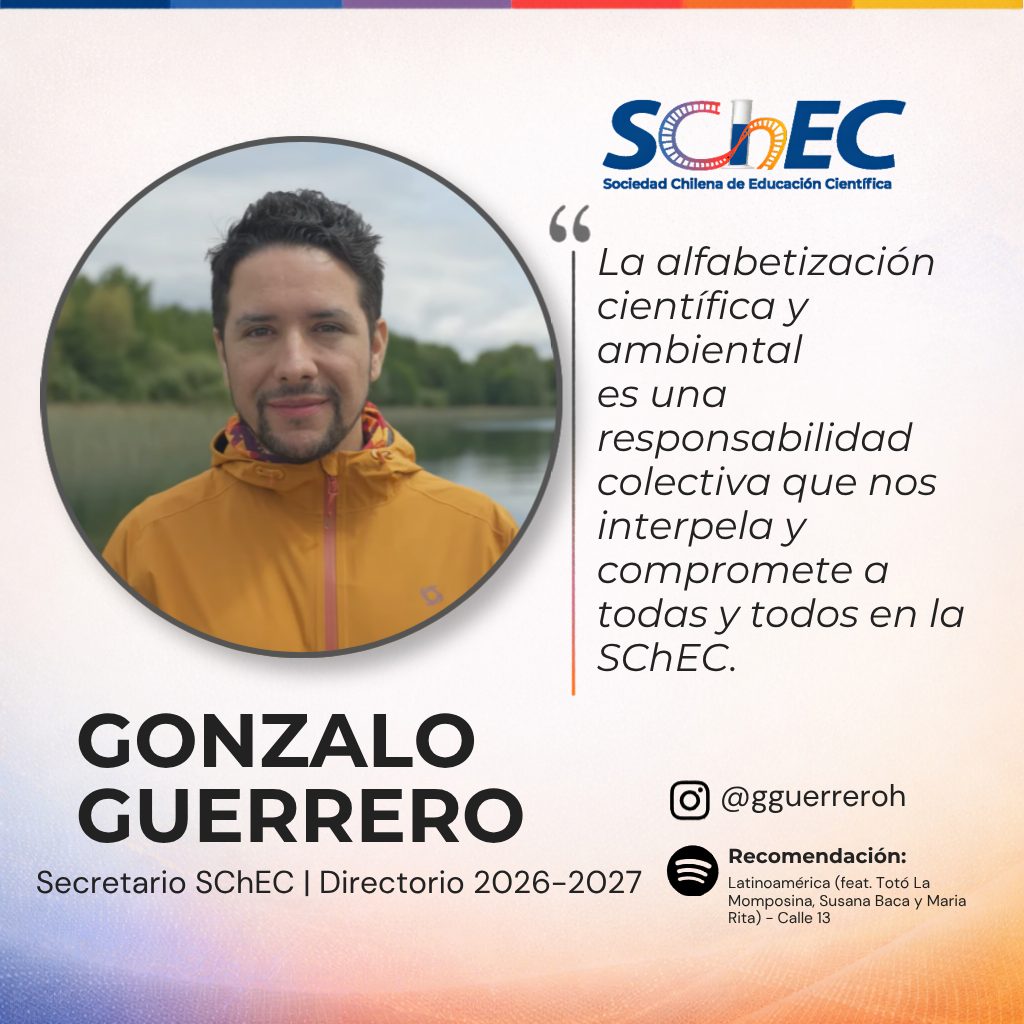 Gonzalo Guerrero es Socio Titular y ex Director Científico (período 2022-2023) de la Sociedad Chilena de Educación Científica (SChEC), profesor de Física y Matemática, académico de la Pontificia Universidad Católica de Chile y Doctor en Educación Científica y Ambiental (PhD).