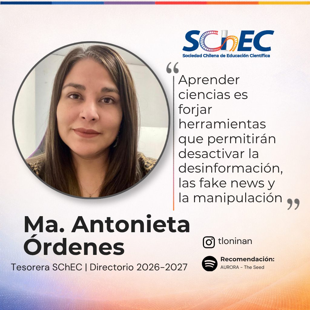 María Antonieta Órdenes Guzmán es Socia Titular de la Sociedad Chilena de Educación Científica (SChEC) y se desempeña como tesorera en el directorio 2026–2027.